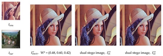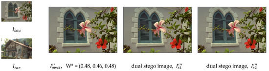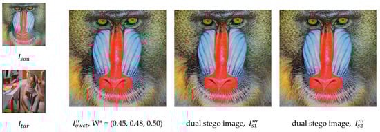 3. Producing the stego pair of components in three channels, , , and , from Equation (10), and producing the dual stego images: and |