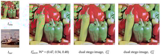 Following up on Example-1, we have constructed the dual-pixel, = ((13, 13), (5, 5), (21, 21)). Let = (, , ) be the secret message vector, and = [−1, 1], = [1, −1], and = [0, 1] represent the corresponding distortion vectors. We can produce the stego component pair, = (13, 13) + (−1, 1) = (12, 14). Similarly, we can produce the other two stego component pairs, = (5, 5) + (1, −1)= (6, 4) and = (21, 21) + (0, 1) = (21, 22). Therefore, the stego dual-pixel produced becomes = ((12, 14), (6, 4), (21, 22)). Note that the corresponding stego pixels in and are = (12, 6, 21) and = (14, 4, 22), respectively. We remark that in Phase-1, these two stego pixels have a 3-ary secret message vector, = (, , ), concealed, and a 7-ary secret message, In addition, in Phase-2, they have also conveyed a 5-ary secrete message vector, = (, , ). Clearly, we can produce the stego component pairs for every pixel in three channels: , , and , by a vector addition shown in Equation (10). Consequently, dual stego images, and , will be produced in Phase-2.