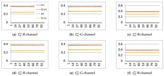Figure 11 shows the RS diagram for the RGB-channel of the dual stego images produced by our algorithm. The diagram depicts regular and singular groups with respect to different masks as functions of the embedding ratio from 1 to 100 %. As shown in the graph, , , , and for all embedding ratios, indicating that the difference between and exhibits no significant change as the number of embedded messages increases. In other words, the message embedding does not substantially change the number of regular or singular groups. These figures confirm that our proposed scheme is able to resist the RS steganalysis attack.