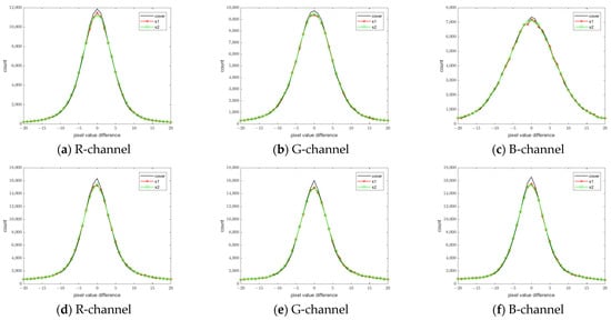 Figure 12 shows the PVD histogram in which is considered as the cover, and the PVD histogram in the dual stego images, and are denoted as “s1” and “s2,” respectively. The diagrams of three PVD histograms closely overlap, indicating that there is no substantial change in the shape of the PVD histograms before and after the message concealment. Thus, our algorithm preserves the smoothness in and and its ability to resist the PVD histogram attack.