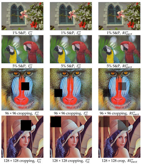Figure 13 exhibits visual inspection of the attacked stego images. Note that the attacked areas in the restored image, , are not all black because pixel values are still correct in some of the Red, Green, and Blue channels. Nevertheless, the details of the image contents can still remain visible, and the effects of attacks are limited, thereby indicating the ability to resist the noise and cropping attacks.