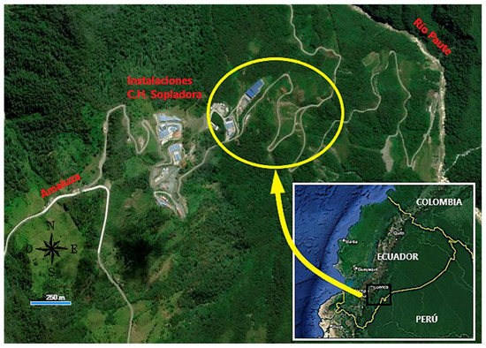 The area’s geomorphology is that of a somewhat open V-shaped valley with general slopes of the flanks ranging from 35° to 45° and that locally can reach an over 60° incline (in rocky substrate outcrops). The bottom of this valley is crossed by the Paute river from the northwest to southeast in the northeast study area (see Figure 1 and Figure 3).