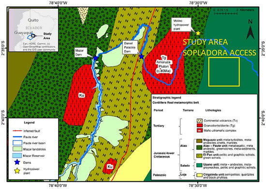 The investigation area is at this regional metamorphism belt in the oriental part of the Andes mountains. The local geology is characterized by outcrops of metamorphic materials from the Upano Unit, belonging to the Salado Group, which Litherland had defined in 1988. This metamorphic basement is composed of: metandesites, green and sericitic schists, tuffs, and metagrauwakes that occupy a vast expanse of land throughout the area that includes a strip of about 30 km wide and more than 60 km long, with a north–south direction, approximately. These basement materials in the study area have layer directions against the slope, and the stratigraphy may present dip angles up to 70° to the west in some areas (Figure 3).