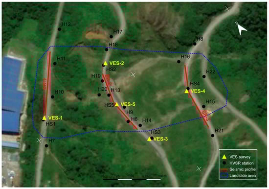 Situation map of surveys (noted that the north is rotated counterclockwise) and observed landslide area (blue dashed line). Black dots: HVSR surveys; yellow triangles: VES surveys; and red lines: seismic refraction and MASW profiles, both made at the same position. White crosses refer to the coordinate points (Modified from [22]).