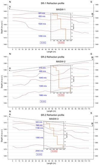 The next level, the third one, is defined between 1024 and 1196 m.s−1 P-wave values and would correspond to a more compact sediment level with boulders and/or rock blocks where probable humidity increases (Figure 5). The presence of a transition zone from these fillings to eluvial material could be correlated to the fourth level, where the compressional velocity is clearly over 1000 m.s−1 (1390 to 1450 m.s−1). No more interfaces were defined under this level at the SR-1 profile, so it is a semi-infinite space here.
