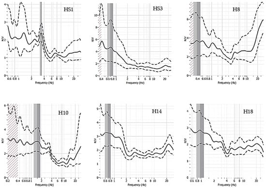 The processing of the HVSR data has been carried out using the free software GEOPSY (www.geopsy.org, accessed on 10 January 2022), composing the records of the horizontal geophones (directions N-S and E-W) geometrically and applying the fast Fourier transform (FFT) on the time windows of 20 s established in the records once filtered [32].