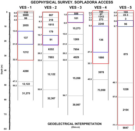 Firstly, the apparent resistivity field curves obtained in the VES surveys have been inverted, and a layers’ vertical distribution (resistivity and thickness) was performed for every test. These results provide the first definition between the rocky basement and sedimentary overburden from a high contrast in resistivity values.