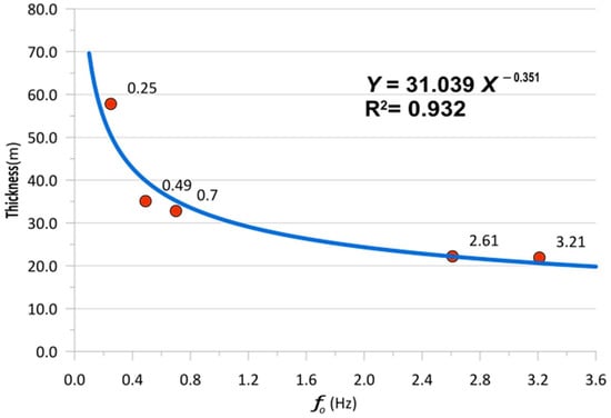 At the parametric control points, the thicknesses of the sliding materials (those that exhibit shallow lower resistivity and seismic velocity values) were defined from those of the compact substrate (considered fixed, with higher geophysical values). The empirical relationship obtained from VES points results related to soft sediments thickness correlated with the natural frequencies values of the ground fo (obtained from HVSR surveys executed at control points). The empirical Equation (3) obtained has an a factor of 31.039 and a b factor of −0.351, with an adjustment error of R2 = 0.932, which is considered a good correlation value.