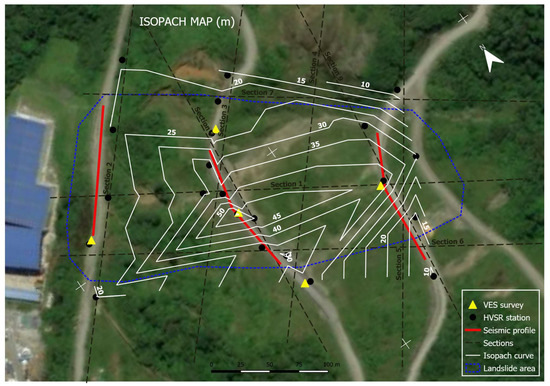 In some landslide material conditions, where a high contrast impedance could exist (soft soils or sediments directly over a rocky substrate, as in this investigation area), shear and compressional waves can predict its position [27]. Nevertheless, compacity or density variations could still affect the relationship, and more than the HVSR technique is needed [28,29].