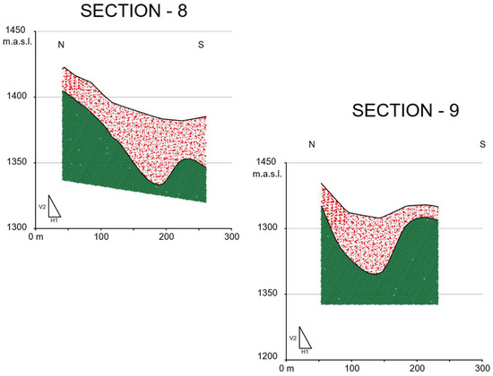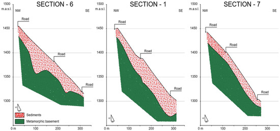 To complete the analysis, it was drawn over the isopach map, across several sections. Figure 9 shows the position of the sections that have been made to analyze these results obtained (black dashed lines). Figure 10 shows the longitudinal sections of the landslide (according to the direction of movement), and variations can be observed in the bottom and the position of the rocky substrate (Section 6) with a section (central Section 1) in which a typical distribution of a landslide with a thickening of the materials in the lower part caused by deposition.