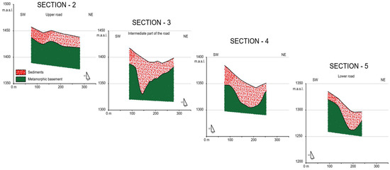 Four cross sections of the landslide (considering the movement direction) were traced on the area, and two others with the oblique north to south direction (see Figure 9 to identify its position). Figure 11 shows, from left to right, upper sections to lower ones. They show an important deepening at the center of the landslide area, and at Section 3 (over the intermediate position of the access road), a V-shaped area deeper than the other ones can be seen. The same deepening zone can be observed in oblique sections (see Figure 12) where the V-shaped sediment geometry is wider, but in all cross-sections, one of the flanks of that deepening area is sharply steep.