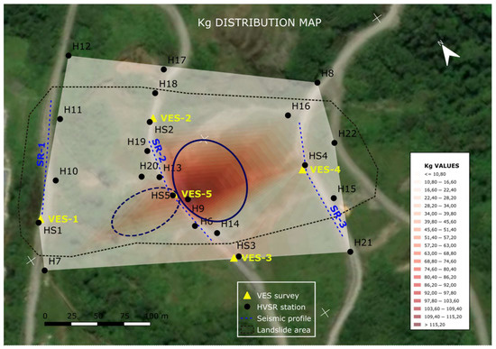 A distribution map of the Kg values was represented in the investigation area. The maximums values coincide with the area presenting the most significant instability now (marked with dark blue ovals). White crosses refer to the coordinate points (Modified from [22]).