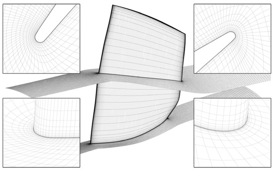 The viscous and inviscid fluxes were determined using second-order Jameson-type dissipation, and an explicit Runge–Kutta scheme was applied for time discretization. The Spalart–Allmara (S–A) model was selected to close the RANS equation. As one of the most successful one-equation turbulence models, the S-A model performs well in the boundary layer and pressure gradient area, so it is widely used to predict complex flows with separation, showing attractiveness in turbomachinery analysis. Moreover, the S-A model in NUMECA has been widely validated and applied [30,31,32], and it consumes less additional CPU and memory than the k–ε model.