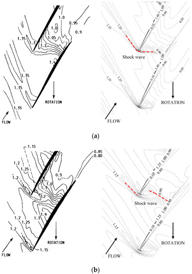 Relative Mach number distribution of the experimental [33] and CFD results: (a) 90% span of the experimental (left) and simulated (right) results; (b) 70% span of the experimental (left) and simulated (right) results. Red dotted line is to denote the shock wave.