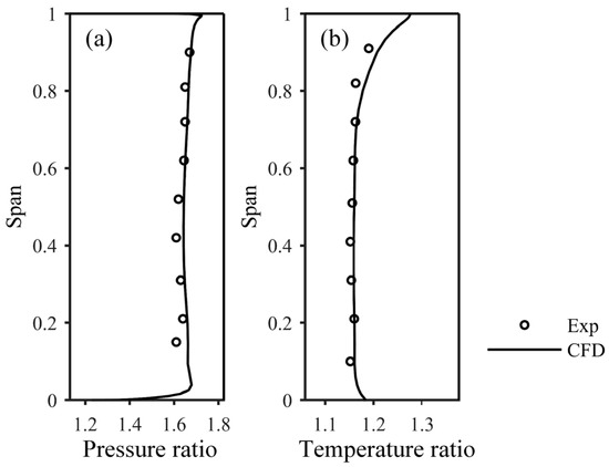 The pressure ratio and temperature ratio distributions of the near-peak efficiency are plotted in Figure 6. The CFD results fit the experimental results well. The CFD tools and methods were confirmed to give suitable results and were then applied to generate and evaluate the rotor geometries generated by agents.
