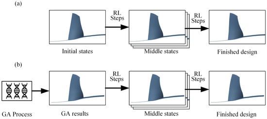 As shown in Figure 9, the GA process was considered the first step of the MDP, which provided information by giving the initiating state of the agents. In Figure 9a, the trained agents learned the design policy but could not determine the initial state to start an MDP itself, so the state of the reference rotor was selected as the initial state. After several modification steps, the performance improved, and the MDP ended. In Figure 9b, however, the result of the GA process acted as the initial state of the MDP. The agent gave different actions and made relatively minor modifications to the GA results, which kept the result gained by the GA when trying to improve the performance further.
