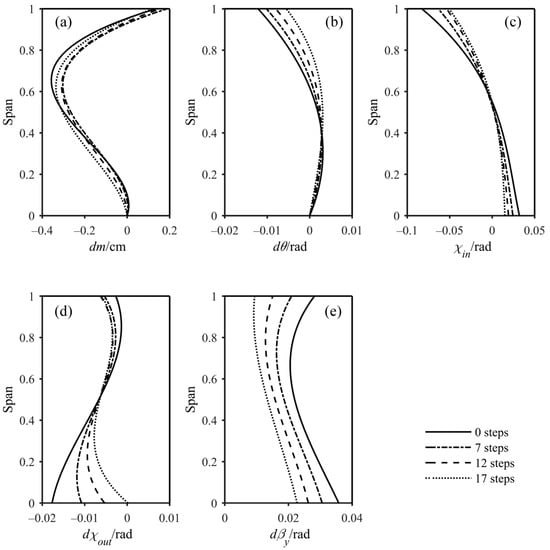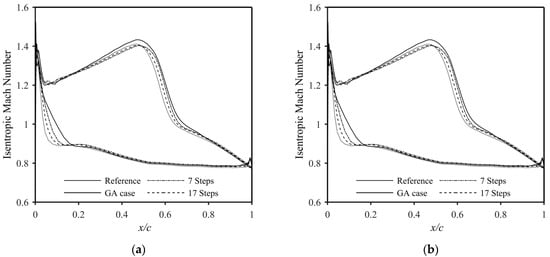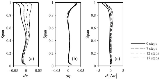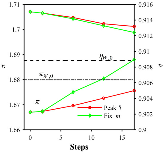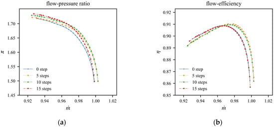 Figure 10 shows the operating characteristics of the rotors after different steps of modifications from the reference rotor. The more steps were taken, the higher the pressure ratio was. After the 15-step modification, and were almost equal to the reference, and increased by 1.01%. The agent further improved the pressure ratio if a slight decrease in was accepted. The trained agent could start the design at different states and modify the geometry very quickly, enabling cooperation with other optimization methods.