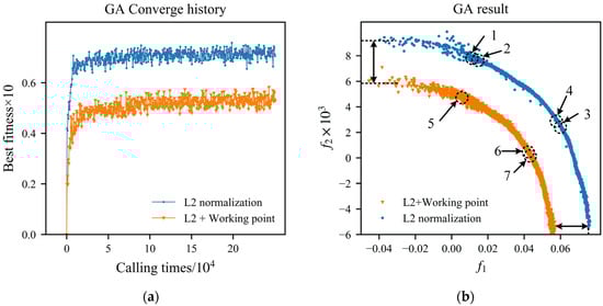 The evolved population is shown in Figure 11, and the maximum fitness of each generation was monitored as shown in Figure 11a. As the evolution process continued and the calling times of surrogate models increased, the maximum fitness increased and fluctuated within a specific range. Surrogate models markedly reduced the calculation cost so that the population could evolve adequately. The population’s fitness after 500 generations was plotted in Figure 11b, revealing a prominent Pareto front. The evolution of each condition was repeated five more times and plotted together, verifying that the influence of random parameters in the GA process had little influence on the results. The term changed the distribution of the fitness function, so the Pareto front was shorter than before, and its value changed after constraining the working point.