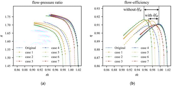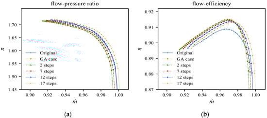 The average mass flow variation at the working point of the final population was calculated as = 0.0016 before applying the working point constraint and decreased by 61.25% to 0.0069 after was added. As also shown in Figure 12b, the working points of cases 5, 6, and 7 were closer to the original case and to each other, showing that worked well.