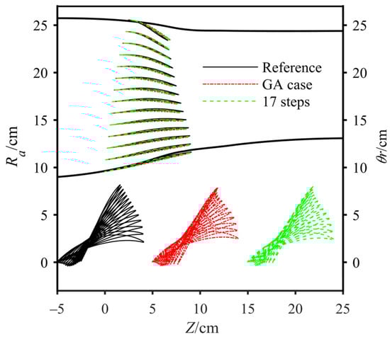 In summary, the GA step improved the efficiency by adding a combined sweep feature and a combined lean feature and changing the 2D airfoil features. The efficiency improvement arose mainly from the separation and shock wave reduction, which simultaneously declined the pressure ratio. Then, the agent modified the 3D feature, changed the distribution of , , and decreased to obtain a higher pressure ratio. Most of the beneficial features of the flow field were retained, so the efficiency remained high compared with that of the reference rotor.
