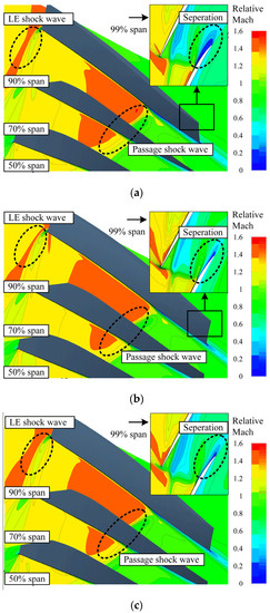 As marked in the 90% span surface, the shock wave at the leading edge and in the passage could be identified. The forward sweep feature diminished the Mach number before the shock waves compared to the reference, as shown in Figure 19b, which reduced the shock loss and the pressure rise. After modification by RL agents in Figure 19c, the shock wave at the leading edge became stronger and consequently increased the pressure ratio, while the passage shock wave remained nearly unchanged. In addition, since the shock waves changed, the peak relative Mach number at 50% and 70% span also lowered slightly.