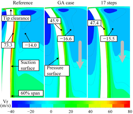 Figure 20 showed the radial velocity Vr distribution at the 80% length axial surface to analyze the radial secondary flow. The air near the suction surface flowed from the hub to the shroud because of the centrifugal force and was influenced by the radial pressure surface. The maximum Vr near the suction surface and the minimum Vr at the same spanwise location were plotted for each rotor, and it was apparent that Vr declined after introducing the lean feature. As the RL agent modified the rotor further, Vr increased slightly because the lean feature was slightly diminished.