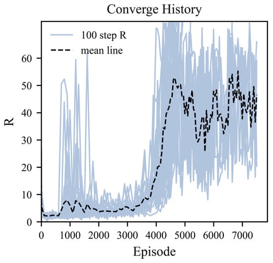 The convergence history when training the agent was plotted in Figure 24, where the mean line was calculated by all R curves still in training. The training process was repeated several times to reduce the influence of randomness in network initialization and noise action. The mean R increased before 5000 episodes, and many agents converged and stopped training, so the mean R decreased at 5000–6000 episodes. One episode contained 100 steps, so 5000 episodes corresponded to 500,000 calls of the surrogate model, approximately two times that of the NSGA-II evolutionary process and on the same order of magnitude. The agent learned the policy of the whole design process with the same order of magnitude of computational cost as NSGA-II learning a Pareto front.