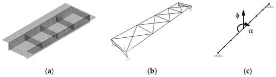 The identification pattern of the structures consists of a letter that represents the structural scheme [S: simply supported; C: continuous; F: fixed (clamped-free)], followed by a number that indicates the span length (in meters). For the analyzed bridges, 3D shell models were created, as shown in Figure 3a.