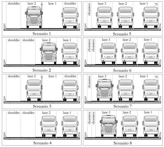 For the traffic analysis, eight different scenarios were defined (Figure 5), varying the position and direction of the lanes and the transverse position of the vehicles, aiming to map a large amount of possibilities for vehicle arrangements among the lanes [38], and in addition, to forecast possible exceptional situations such as vehicles traveling close to the Jersey barrier, which are needed for the Ultimate Limit State design. The vehicles’ positions always simulate the worst situation for the right girder (G1). In even-numbered scenarios, there is a reallocation of lanes to characterize exceptional or emergency situations [11].