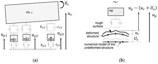 where me, ce and ke correspond to the generalized mass, damping, and stiffness parameters and φjk is the jth eigenvector component at node k of the structure where there is a tire contact point. At each vehicle-structure contact point, interaction forces of elastic (fei) and damping (fdi) components are generated as functions of the relative displacement and velocity between the axle mass mpi and the structure contact point, considering the pavement roughness profile (ur), as shown in Figure 6b.