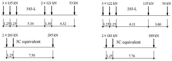 To apply step (b) consistently, for each analyzed effect on each bridge, all vehicles that generated, together, the maximum static effect should be considered in the dynamic analysis. However, up to now, it has been carried out by a simplified procedure, since the analytical-numerical model for the dynamic analysis (Section 6) has been validated experimentally only for class 3C vehicles [25]. Aiming to apply this model for other vehicle configurations, the concept of an equivalent 3C vehicle was devised in which vehicles of other classes are reduced to a 3C truck [27]. Figure 7 shows examples of this reduction. Each axle of the 3C truck may represent a group of axles of the actual vehicle with equivalent properties of mass, stiffness, and damping of the original ones, so that natural frequencies of the fundamental vibration modes of both mechanical systems are similar.