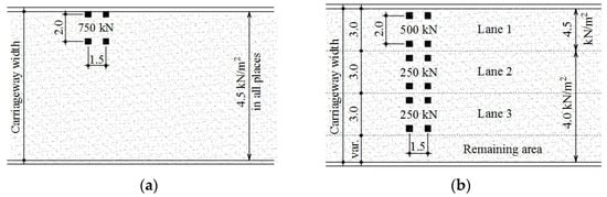 For each set of geometric features, the load model with the smallest weighted error (mth, 1 ≤ m ≤ NLM) is chosen as the most appropriate (NLM: number of load models). Several hypotheses were tested; each one considered a different set of geometric characteristics and search restrictions in the relative and absolute values of the loads per design range. The width of the design lane was set at 2.00 m. Some possibilities were considered: one or three design lanes; design vehicle with two or three axles; and wheelbases measuring 1.30 m or 1.50 m. The seek process was carried out by choosing two load models considered as representative of the actual Brazilian traffic in these structures (Figure 8), named “load model 1” and “load model 2”. Interruption of the load distributed around the design vehicle contour, as done in NBR 7188, was not considered. In both models, the wheelbase was equal to 1.50 m, similar to the model from the Brazilian design code. Weighted errors for models 1 and 2—Equation (8)—are 6.9% and 5.6%, respectively. The load model 2 follows the configuration of the Eurocode 1 model LM1. One of the AASHTO live load models also consists of a design tandem as in load model 1, but is combined to a linear distributed load.