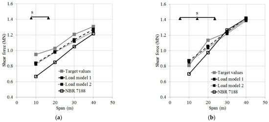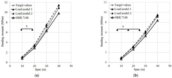 In Figure 9, Figure 10 and Figure 11 the target values are compared to the effects generated by load models 1 and 2; the NBR 7188 TB-450 model [23] is also used for comparisons, including its impact factor. Ratios between effects generated by each load model and the corresponding target values are shown in Table 8.