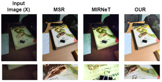 Many industries, such as photography, security, medical imaging, remote sensing, and many others use image restoration to restore high-quality visual content from damaged versions. Image enhancement methods concurrently adjust a given dark input image’s color, contrast, brightness, and noise. Typically, two types of existing deep learning models are used for image enhancement, denoising, or deblurring, namely the encoder-decoder model [1] and/or high-resolution (single-scale) feature processing [2,3]. Some of the limitations of the published methods are shown in Figure 1. The MSR model [4] optimizes the maximum parameters through backpropagation instead of depending on artificial environments. However, in the MIRNeT [5] model, the output images exhibit blurring issues and color degradation, as shown in Figure 1. The authors of [5] focused mainly on improving image contrast and brightness using the predicted illumination map. However, the noise in dark images is unavoidable and cannot be neglected while enhancing the image.