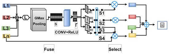 Following the feature vector J, for an individual resolution stream, three parallel channel upscaling were performed in CONV layers, producing three feature descriptors , , and with size (each value represents the information for one channel) squeeze vector. Second, Select—the attention module is activated and applied the softmax function operator for adaptive recalibrating multi-range feature maps. Subsequently, the general features of the recalibration and aggregation processes were computed. However, SKFS produced better results with six fewer parameters than aggregation with concatenation.