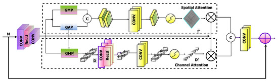A method was necessary to communicate information within a feature tensor, along with the spatial and channel dimensions, similar to the SKFF block for information across multi-resolution branches. Therefore, a dual attention unit (DAU) was implemented in convolutional streams to extract features [24], motivated by the developments of current low-level vision algorithms based on attention mechanisms [24]. Figure 5 represents the schematic architecture of the DAU. Only more informative characteristics are permitted to proceed after the suppression of less valuable ones by DAU. Channel and spatial attention processes were used to achieve feature re-calibration.