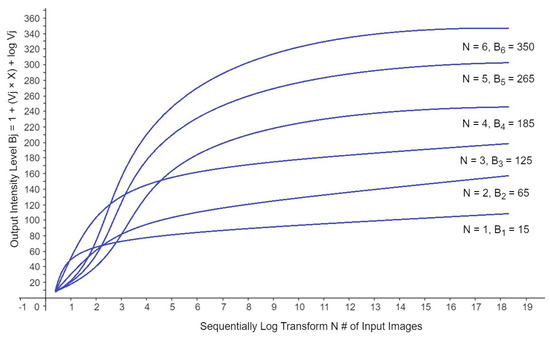 Graphical representation of sequential multiple scale logarithm transformations of the dark input image.