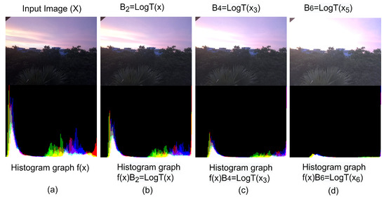 Here, the convolution window decreases the channels to three individual channels, ReLU is maxed and the resulting is a CONV kernel with three output channels, which improves the nonlinear image [9]. Based on the previous operation, this section primarily intends to improve the image via the weighted addition of several logarithmic transformations, which speed up network convergence and downsampling, increasing the shift-equivariance of the network. The graphical representation of multiple log transformations of the dark input images is shown in Figure 6. From Figure 6, it can be determined that the intensity level of low-light image increased with one after another input image log transformation. In the initial condition, the intensity level was low, and consecutively, the output intensity increased. However, the increment lines of the update images intersect each other due to a change in the pixel value at the location of , for example, if the pixel value of at the location was 10, after log transformation, the pixel value at that location of increased to 15, and consecutively, this value again upgrades to .