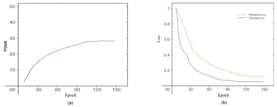 (a) PSNR VS Epoch Curve, (b) Loss VS Epoch Curve [ and , Adam optimizer, 21 batches, 150 Epoch].