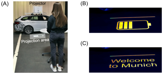 In the automotive sector, near-field projections or displays are used to show graphical or informative content around the vehicle to welcome the vehicle user with a message or design-driven pattern. Additionally, near-field projections or displays can inform the vehicle user with vehicle-based information, such as the battery status of an electric vehicle, or situation-based content, such as weather information at the trip’s destination. Both technologies are considered for communication for highly automated vehicles with other road users (RUs). However, projection-based communication has an advantage compared to display-based methods since a safety-relevant projection can be placed in the field of view of other RUs, e.g., a projected turn indicator to warn an upcoming cyclist of a turning vehicle.