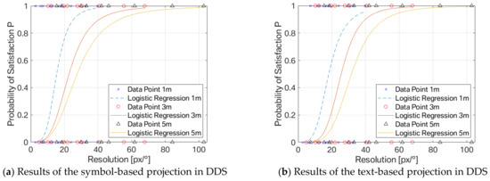 This work’s analysis considers the dependencies of the observer’s viewing distance, different ambient lighting scenarios and various projection content. All discussed resolution levels are the 90% values of the logistic regression function. This quality threshold level is selected to guarantee a high-quality resolution requirement and consider the worst-case scenario, since the executed studies had a fine-grained asphalt surface. However, previous studies examined resolution requirements for displays or projection screens in cinemas, which have a projection surface with nearly ideal characteristics without a tilted view. However, none derives the necessary characteristics from the customer- or pedestrian-orientated perspective, i.e., the perspective of the receivers of near-field projections in future mobility.