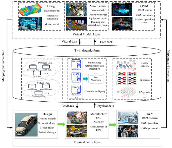 A twin data platform is the core of driving the whole model operation, including data storage, data fusion and analysis. The data resources in a twin data platform comprise the product design data of the design department, manufacturing data of the manufacturing department and the O&M data of the O&M department. It stores the data of the whole physical layer and virtual model layer and their real virtual mapping and iterative optimization data. In addition to storing data, it can also achieve the fusion and analysis of multisource heterogeneous data by utilizing various artificial intelligence algorithms to meet the consistency synchronization between the physical layer and virtual space layer at every stage of the whole life cycle of product, providing more accurate and comprehensive business data support for each unit. Twin data platform provides a comprehensive, integrated data-sharing platform for the design-manufacturing-O&M integration of complex products. It achieves the full-feature, whole-process and whole-business data support of complex products so that the design, manufacturing and O&M process becomes transparent and forms the data-driven closed-loop manufacturing mode.