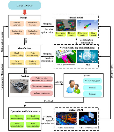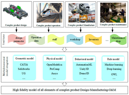 Integrating design-manufacturing-operation and maintenance (O&M) of complex products is critical for intelligent manufacturing. Complex products refer to products that use high technology, complex processes, a large number of parts, a large number of levels of product structure, a large number of changes in the relationship between parts and products, and at the same time, have a high value, such as large ships, high-speed trains and carrier rockets, etc. They have the characteristics of interdisciplinary, multidepartmental collaboration and high integration [1]. The manufacturing mode of complex products is small-batch, multivariety and customized. From the perspective of engineering technology or management, due to its large number of subsystem components and complex system composition relationships, the whole process—from design to manufacturing as well as operation and maintenance—has extremely high complexity and difficulty in its operation [2,3,4].