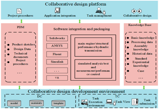 The intelligent collaborative design platform of a complex product, as shown in Figure 4, is developed based on uniform IT architecture and general business components by centering on the design process of a product. Such a platform develops the dedicated business components based on the demands of users, integrates various modeling and simulation software in combination with the product’s design process, and constructs the professional application system, which supports the efficient design and iterative optimization of the product owns the independent knowledge library. The platform could achieve the user management, function management, system parameter management, log management, etc., develop the corresponding module based on the accompanying research and development features of the complex product via a breakthrough of the existing design model, and achieve the unified scheduling and management of the software, model, process, data and knowledge library used in the whole product digital design and simulation verification system, as well as multisource heterogeneous information integration of knowledge library, database, etc.