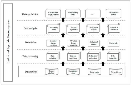 To provide better services for the design, manufacturing and O&M integration of complex products, it is necessary to carry out multisource heterogeneous data fusion and analysis. The data fusion analysis framework diagram based on digital twin, shown in Figure 7, is divided into five layers: data collection, processing, fusion, analysis and application. The full-feature data of a complex product’s construction design, manufacturing and O&M digital twin body is mainly collected, including the physical entity data, virtual model parameter data and their interactive data. In terms of data processing, the processing of missing values of these data, noise processing, etc., are involved. In data fusion, the neural network and body modeling technology are mainly utilized for uniform formalization indication of multisource data structure and semantic heterogeneity, and the fusion of multisource heterogeneous data is achieved per the data fusion rule. Regarding data analysis, various data mining algorithms are used for the prediction, correlation analysis, evaluation, etc., of data. The data fusion and analysis technology could provide the needed value information for the product design, manufacturing and O&M integration process.