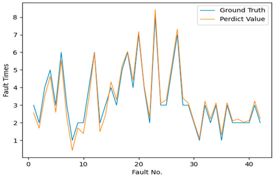 To realize the prediction of the number of failures, an LSTM network prediction model is established, which includes an input layer, a hidden layer and an output layer. This experiment uses the fault data from the past 20 years of a CRH series EMU for model training. The training data set is 5400 key component failure data recorded from 2000 to 2020, accounting for 80% of the total data. First, the data is normalized to remove the dimension difference, and the processed data is input into the LSTM model for training. Considering the small amount of data in this paper, the number of hidden layers of the LSTM model is set to 1, the training step is set to 2, and the number of training rounds is set to 200. To test the effect, the failure data of a certain year can be randomly selected, and the prediction effect of the model is shown in Figure 9.