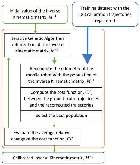 As stated above, the difficult physical interpretation of the parametric optimization results obtained in [] combined with the difficulty of establishing feasible limits to the parametric search suggested the implementation of an alternative non-parametric calibration of the inverse kinematic matrix of the mobile robot. The complete procedure used in this non-parametric calibration is described in Section 3. The optimization is based on the multivariate search capabilities of the genetic algorithms, which are less prone to local minima than other gradient search algorithms. The computation of this non-parametric optimization required 637 s in the same high-performance workstation used in the reference parametric optimization [] (29% less time).