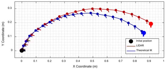 Odometry is a direct computation method that provides a periodic estimation of the relative displacement of a mobile robot through the use of its inverse kinematic matrix, its previous orientation and position, and the estimation of the angular rotational velocity of its driving wheels. Odometry is cumulatively updated from tens to hundreds of times per second so any inaccuracy in the definition of the inverse kinematic matrix of the robot causes systematic trajectory estimation errors. Borenstein et al. [] proposed the University of Michigan Benchmark (UMBmark) test to estimate and correct systematic odometry errors in differential drive mobile robots. The existence of systematic odometry errors in a differential drive mobile robot is usually evidenced when a straight trajectory becomes curved. The UMBmark defines a motion experiment in which a differential drive mobile robot follows a square-shaped path in either a clockwise or counterclockwise direction in order to provide unbiased error compensations in both directions. The UMBmark test assumes that systematic odometry errors are caused by an inaccurate definition of the distance from the wheels to the center of rotation of the mobile robot and by an inaccurate definition of the diameters of the wheels. However, the trajectory of the mobile robot may also be conditioned by such other parameters as the controllers driving its motors [,,]. The effects of all the error sources in the odometry of the mobile robot are usually summarized in the computation of its effective inverse kinematics [].