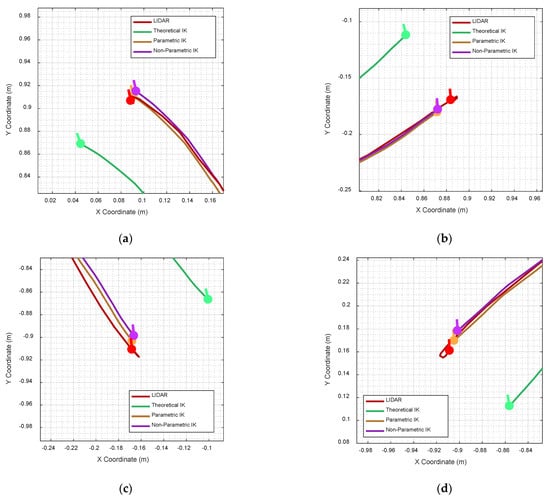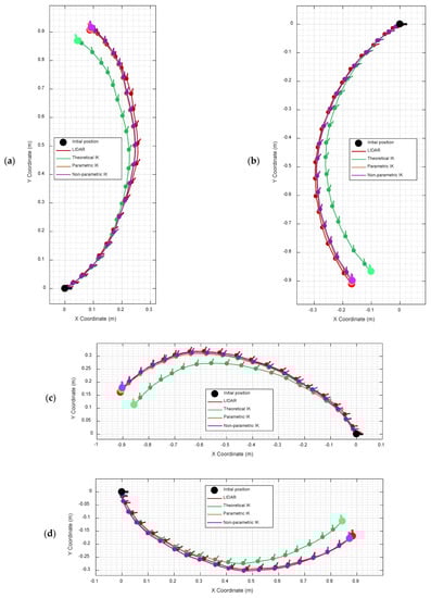 Figure 6 compares the offline computation of the odometry of four randomly chosen validation trajectories (from the 36 × 5 available in the validation dataset). The ground truth trajectory computed from the LIDAR information is labeled in red and the odometry is computed using the different inverse kinematic matrices evaluated in this paper: theoretical IK (green), parametric IK (brown), and non-parametric IK (magenta). Figure 7a–d shows in detail the final position of the robot achieved in the trajectories depicted in Figure 6. Figure 7a–d shows small differences between the ground truth trajectory of the mobile robot (red line) and the odometry computed with the parametric (brown line) and non-parametric (magenta line) inverse kinematic matrices obtained for the APR-02.