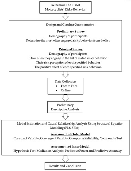 The questions were separated into three parts to determine how frequently motorcyclists participate in specific risky behaviors, how dangerous they believe the risky behaviors to be, and how much they favored or disliked the risky behaviors. Information concerning age, gender, riding experience, motorcycle type, trip purpose, and trip length was also gathered. Data reliability and validity testing were conducted before developing a model to analyze the relationships among the latent constructs using PLS-SEM. The development stages of this research are depicted in Figure 1.